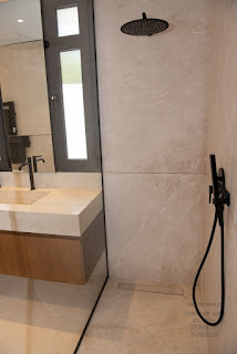 incoming light: Showers are made in a large cut to size piece of Crema Marfil